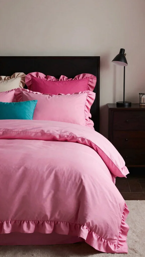 Sometimes, the best decor comes from unexpected contrasts. Pair your pink ruffle bedding with darker color palettes in other decor elements to create a striking balance. This approach adds depth and intrigue, allowing your bedding to shine as a focal point.