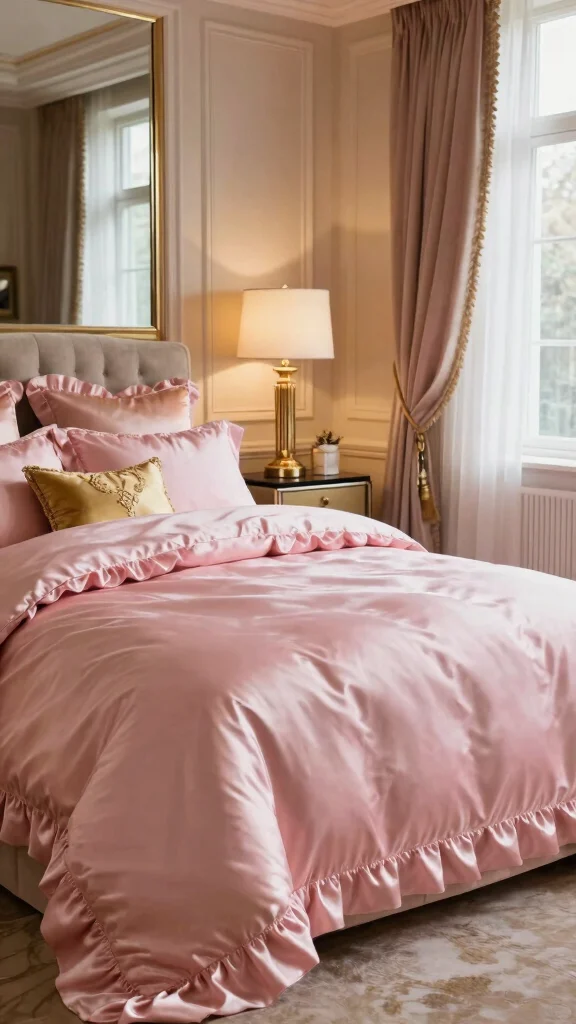 Elevate your bedroom decor with the luxurious touch of pink ruffle bedding featuring an elegant satin finish. This fabric not only feels wonderful but also adds a sophisticated element to your space. Pair it with gold or brass accents to create a chic and modern setting that catches the eye.