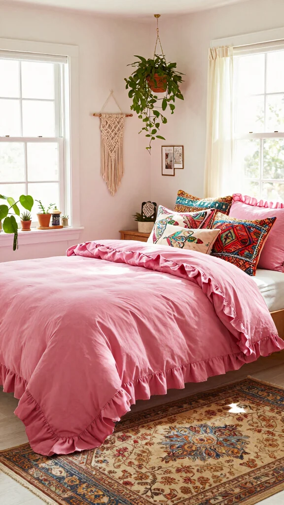 Infuse your space with bohemian flair using pink ruffle bedding that embraces a free-spirited aesthetic. Think playful patterns, tassels, and earthy accessories that harmonize with the soft ruffles. This style creates a carefree vibe, transforming your bedroom into a bohemian paradise.