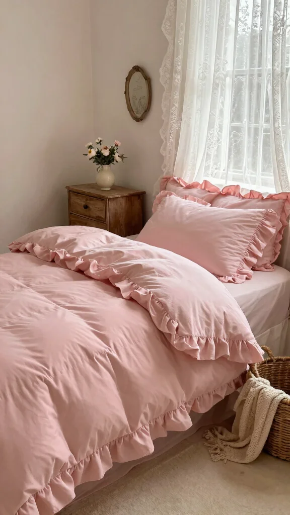 Capture the essence of cottage chic style with your pink ruffle bedding, emphasizing comfort and simplicity. This approach makes your bedroom feel like a charming countryside getaway, where soft, muted shades of pink combined with natural materials create an inviting atmosphere.