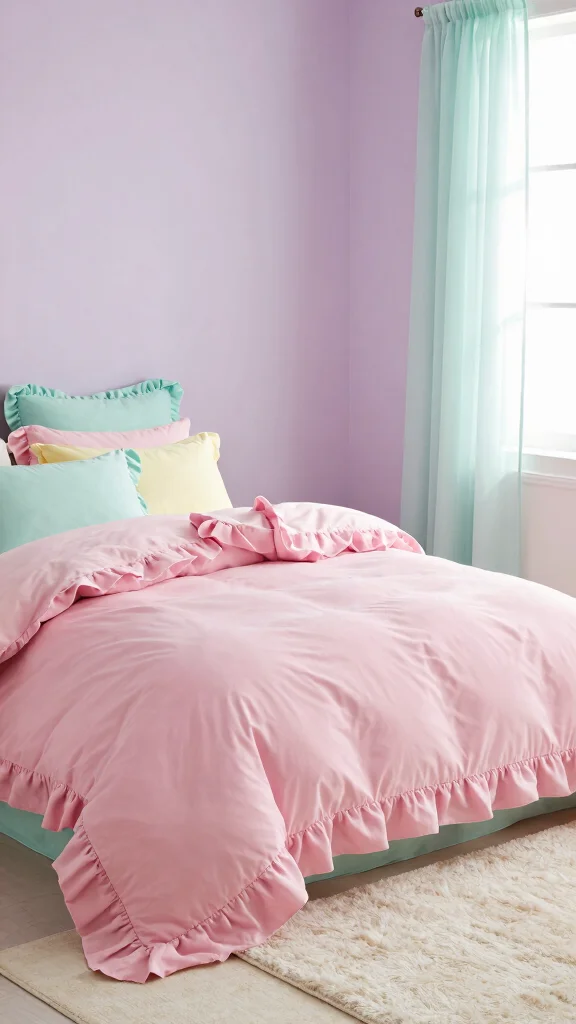Create a dreamy atmosphere with soft pastel interiors that beautifully complement your pink ruffle bedding. Surrounding your bedding with gentle hues enhances the cozy vibe while maintaining a feminine touch, making the space feel inviting.