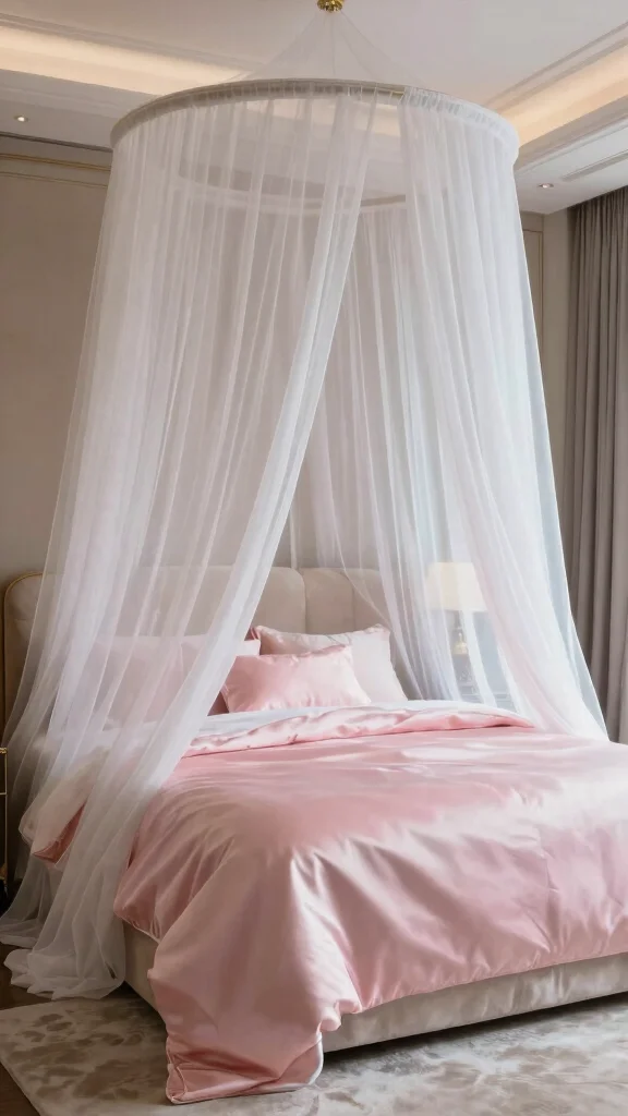 This design not only enhances the glam factor but also creates a cozy nook perfect for curling up with a book. Opt for sheer whites or matching pink fabric to allow soft light to filter in, creating a serene ambiance.