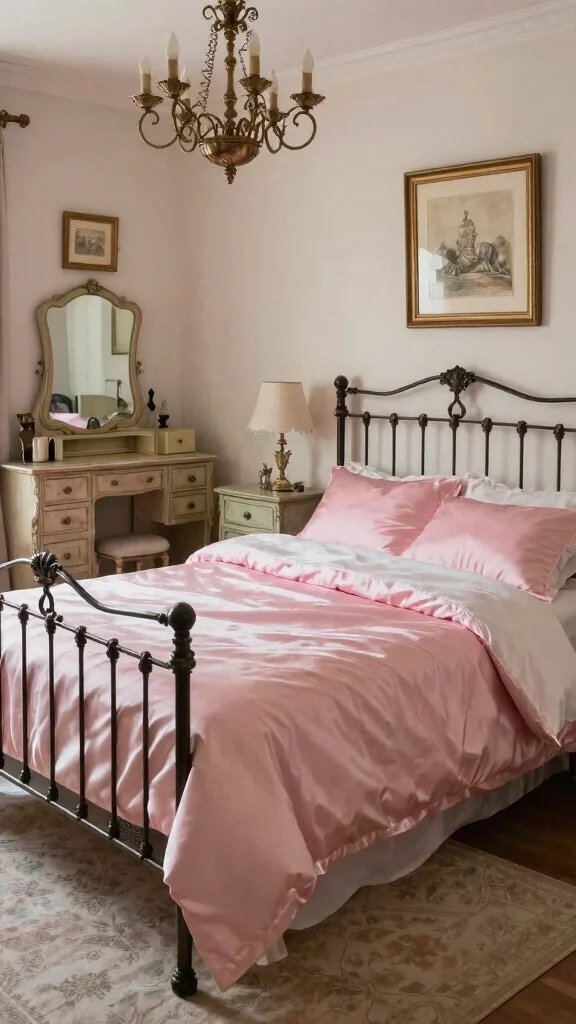 Vintage glam is a timeless style that pairs beautifully with pink satin bedding, creating a warm and inviting atmosphere. Consider incorporating antique furniture, such as a vintage vanity or ornate bedside tables, to enhance the luxurious feel of your satin bedding. The combination of old-world charm with modern comfort is simply irresistible. A pink satin quilt can elegantly cover a vintage wrought-iron bed, adding both comfort and style.