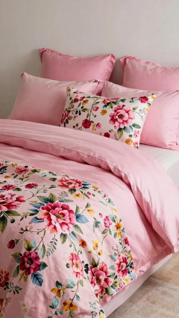 Dare to mix patterns alongside your pink satin bedding for an artistic and bold approach to bedroom decor. This playful design choice allows you to showcase your unique style. Consider combining floral or geometric patterns with your satin bedding for an eye-catching effect. For instance, floral print sheets beneath a solid pink satin duvet can create a striking contrast.