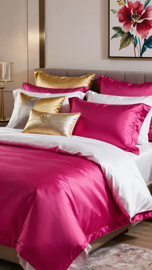If you crave a bold and dramatic statement, fuchsia satin bedding is your go-to choice. This vibrant hue energizes your space while exuding a confident flair. When paired with shimmering gold or silver accents, fuchsia creates a high-end, luxurious appearance. Imagine a fuchsia bedspread atop crisp white sheets, offering a striking visual contrast that captivates the eye. Lively floral patterns in your decor can harmonize beautifully with this bold color, creating a cohesive, vibrant atmosphere.