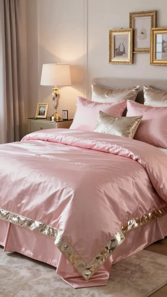 Incorporating metallic accents can beautifully elevate the luxurious feel of pink satin bedding. Think about adding gold or silver decorative elements like lamps, picture frames, or mirrors above your dresser. The combination of satin’s shine with metallics creates an opulent atmosphere, perfect for any glam bedroom. Imagine a gold bed skirt or metallic-threaded throw pillows that complement your satin bedding exquisitely.