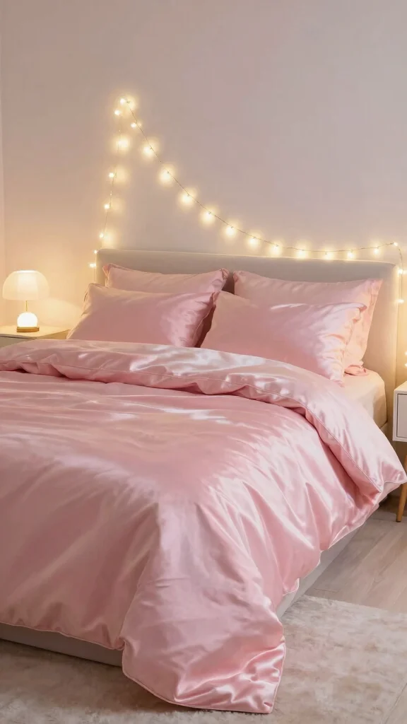 Fairy lights add a magical touch to any glam bedroom, especially when draped around pink satin bedding. You can hang fairy lights around your headboard or under your bed’s skirt to create a dreamy glow, transforming your space into a romantic retreat. The soft illumination enhances the satin’s sheen, adding a touch of enchantment to your evenings.