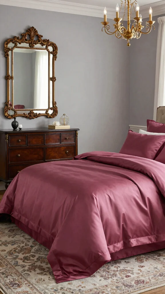Transform your bedroom into a luxurious retreat with deep dark rose pink silk bedding, a bold choice that exudes opulence. This rich shade pairs beautifully with dark wall colors or muted whites, creating a striking visual contrast that draws the eye. Enhance the luxurious feel by incorporating dark wood furniture, and soften the look with cream or white blush pillows for balance.