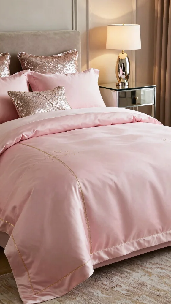 Add a touch of glamour to your bedroom with pink silk bedding enhanced by subtle embellishments or metallic threads. This luxurious bedding pairs beautifully with gold or silver accents, such as metallic lamps or mirrored furniture, creating an upscale ambiance. To further elevate the luxurious feel, layer in sequined or embellished pillows that catch the light.