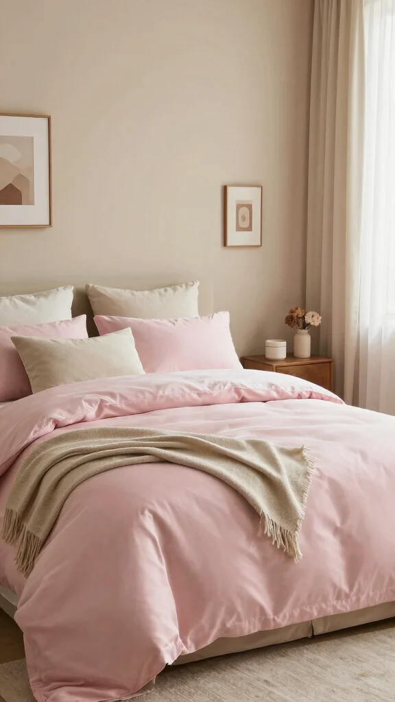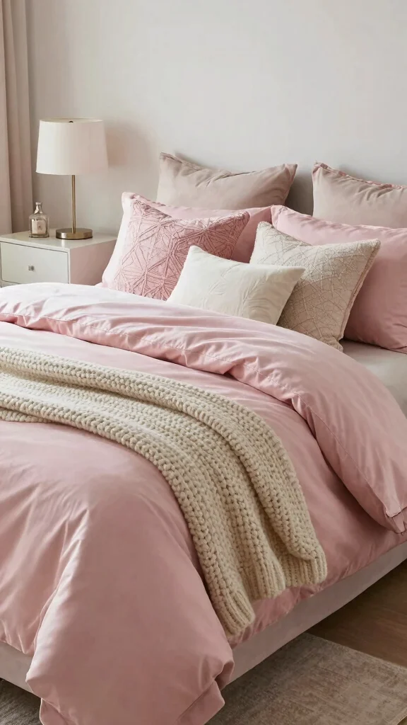 Choose supporting colors that complement the pink, like soft grays or creamy whites, to maintain a calm environment. A chunky knit throw or velvet pillows can provide added comfort and visual interest.