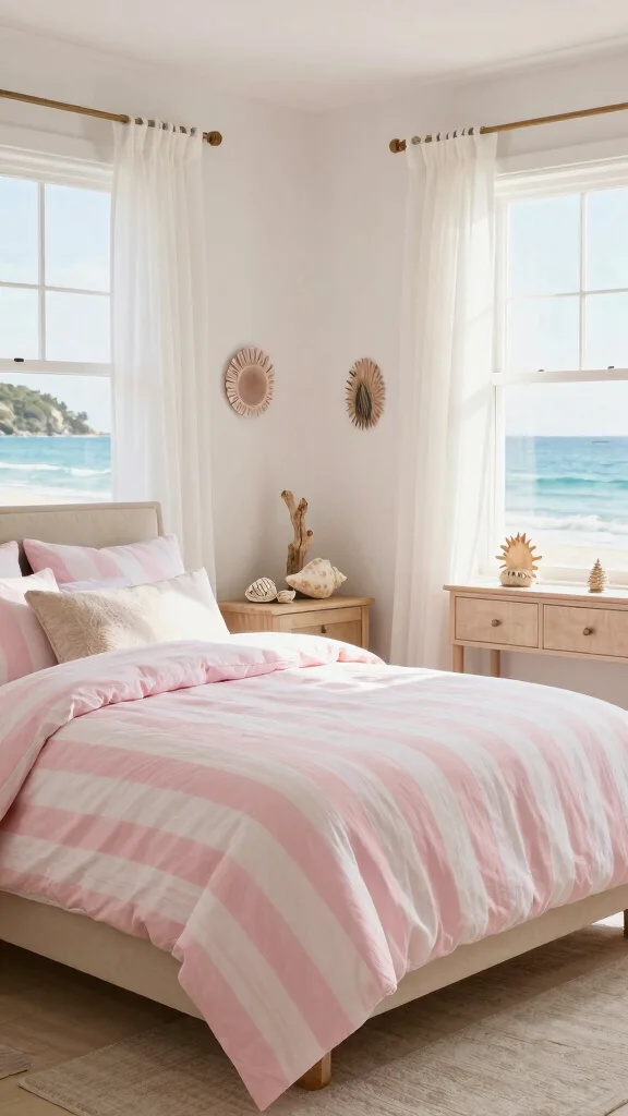 Bring the beach vibe into your bedroom with coastal-inspired pink stripe bedding. Choose light, airy hues that mimic sandy shores and soft sunsets to create a relaxed atmosphere. This style is excellent for making smaller spaces feel fresh and welcoming.