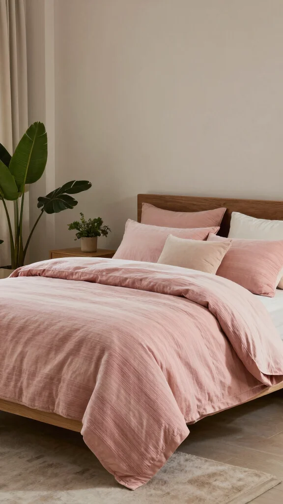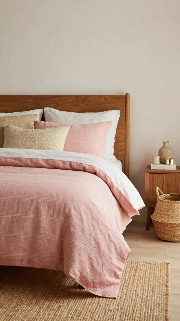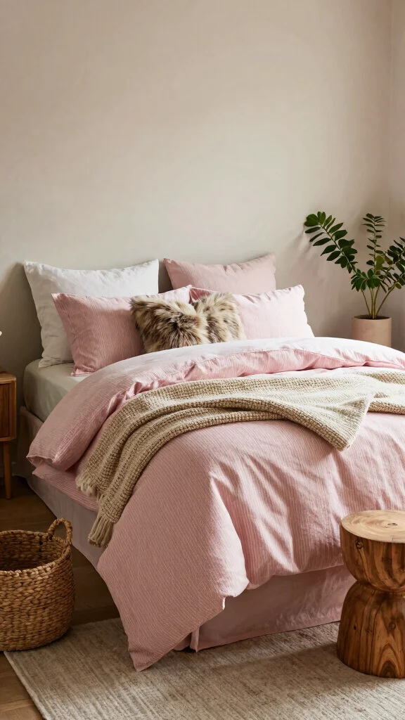 Combining pink stripe bedding with natural textures can create a harmonious bedroom design. By incorporating materials such as wood, linen, and jute, you can foster a warm and inviting atmosphere. This combination enhances the minimalist look while maintaining a cozy appeal.