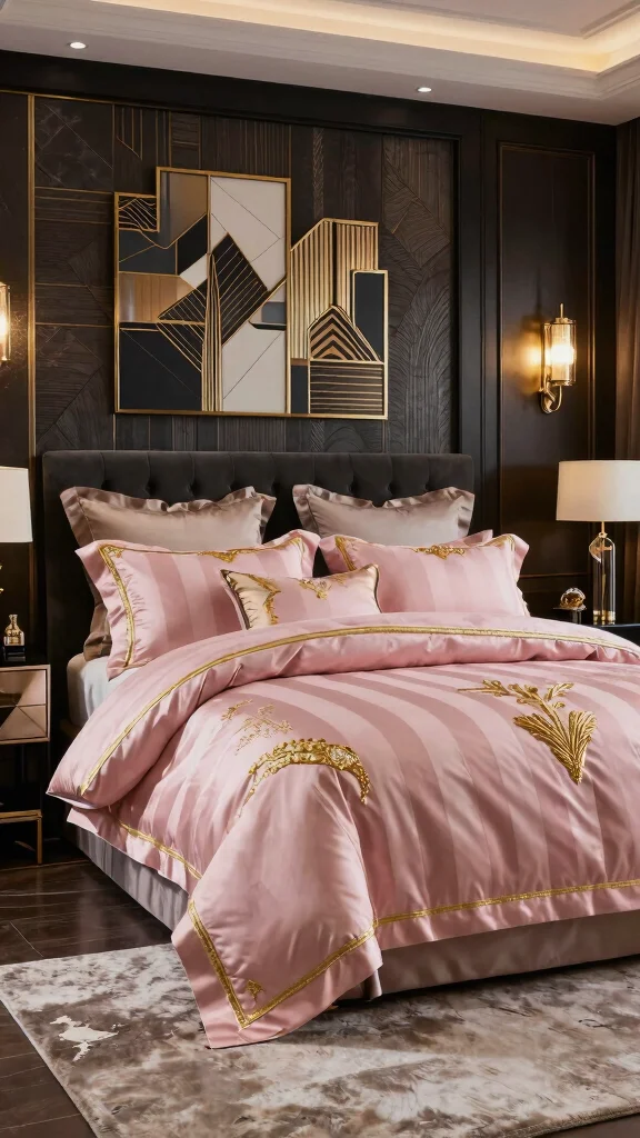 Introduce a touch of art deco glamour into your bedroom with pink stripe bedding accented by gold or black details. This combination offers a stylish twist on classic stripes, perfect for those seeking bold design elements. Art deco motifs can harmonize beautifully with striped bedding, creating a sophisticated and elegant atmosphere.