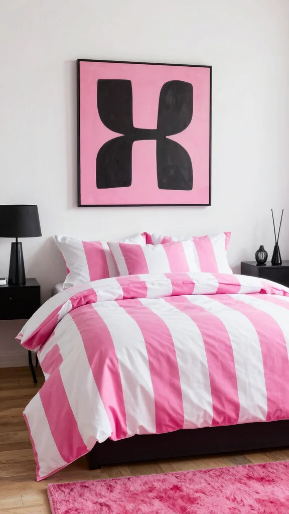 Incorporating diagonal pink stripes into your bedding can add a unique twist to your decor. This playful design creates an energetic vibe, making it especially effective in smaller rooms where you want to maximize visual space. For example, a duvet cover with diagonal stripes can break up monotony, and when paired with crisp white or light gray sheets, it fosters a sense of balance. Adding bold decorative pillows in vibrant colors will further enhance this fun aesthetic.