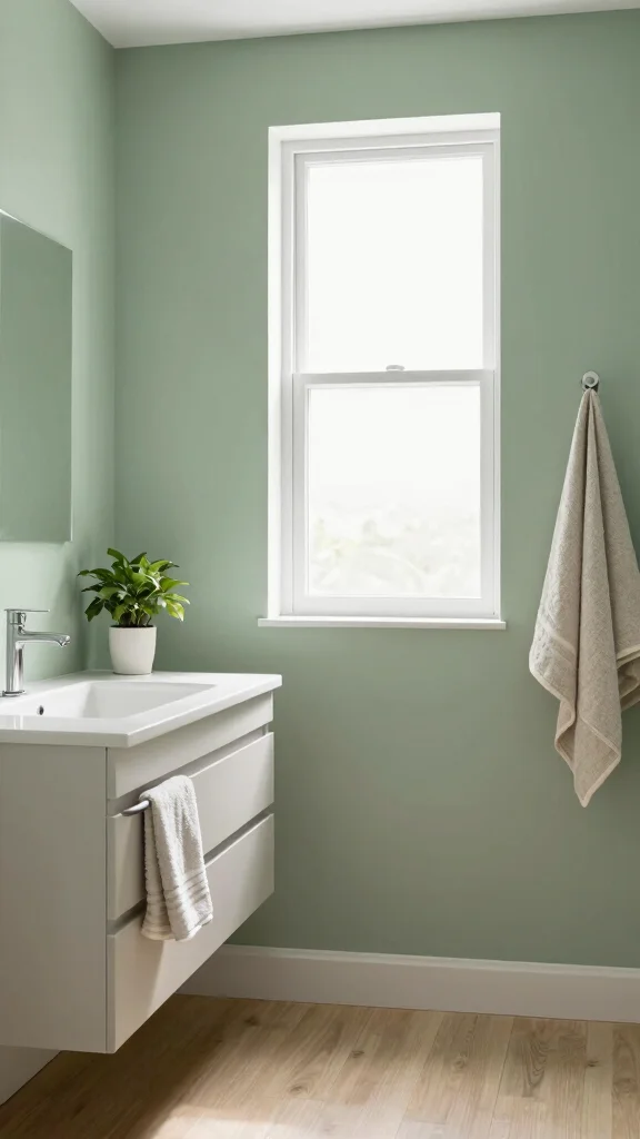 To make the most of this soothing color, choose a matte or eggshell finish for a cozy vibe. If you’re renting, consider removable wallpaper that mimics the look of sage green paint. You can easily brighten the space with vibrant towels or lively artwork that complements the serene backdrop.