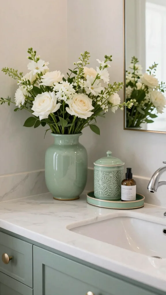 Adding small decorative accessories in sage green is an effortless way to elevate your bathroom’s decor without overwhelming the space. Items like decorative jars, vases, and wall art can infuse personality while maintaining a cohesive look. These thoughtful additions can enhance the aesthetic and make your bathroom feel more curated.