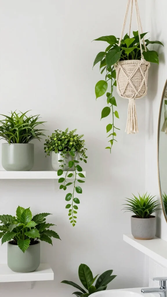 Consider using floating shelves to display small potted plants at varying heights for added visual interest. Hanging plants in macrame planters can introduce a boho touch, while terrariums offer a unique, low-maintenance option for bringing nature indoors.