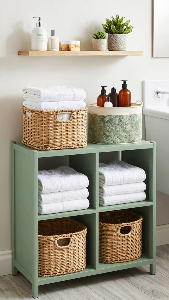 Woven baskets offer a natural look, ideal for towels or toiletries, while stackable bins save space and keep items accessible. Floating shelves can display decorative items while providing essential storage.