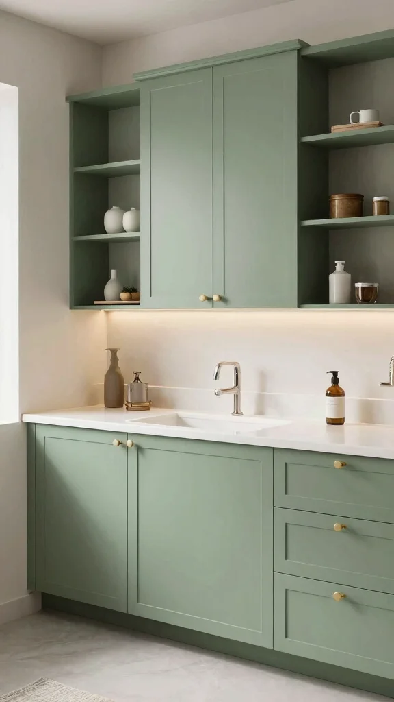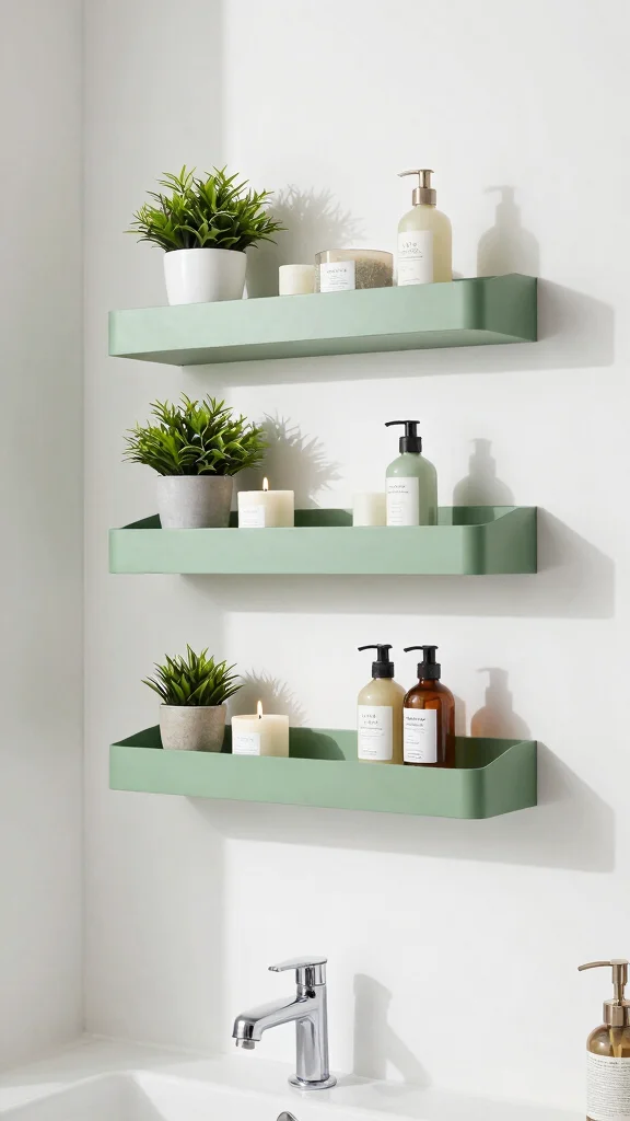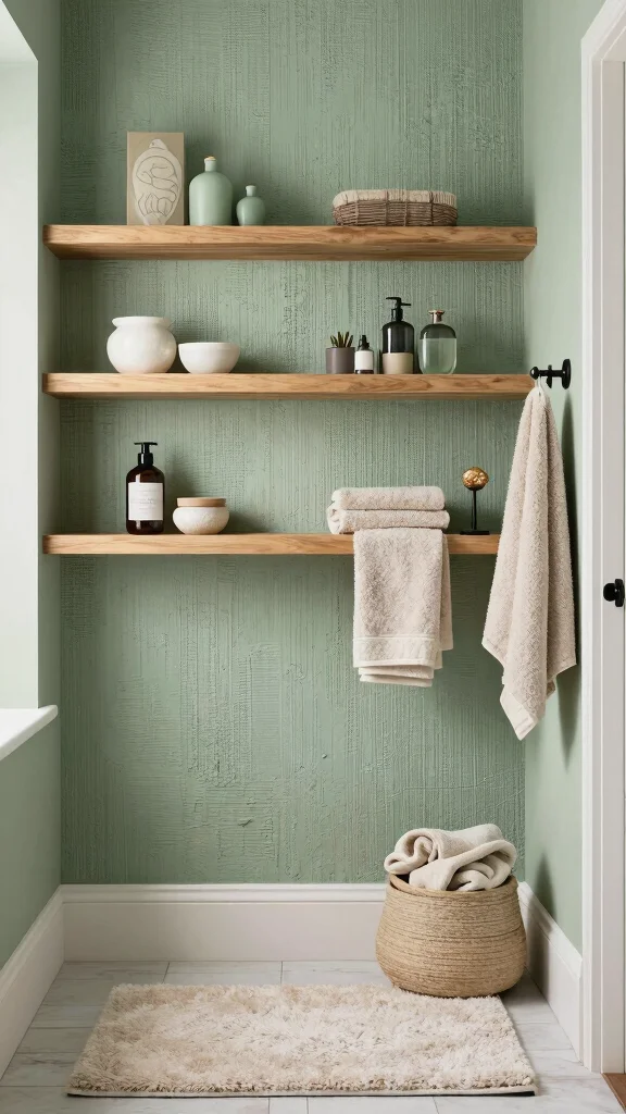 Consider using shelves made from reclaimed wood or sleek metal for a modern touch. Coordinate them with sage green accessories to maintain a harmonious look. This approach combines practicality with a touch of elegance, keeping your bathroom organized while showcasing your favorite decor.