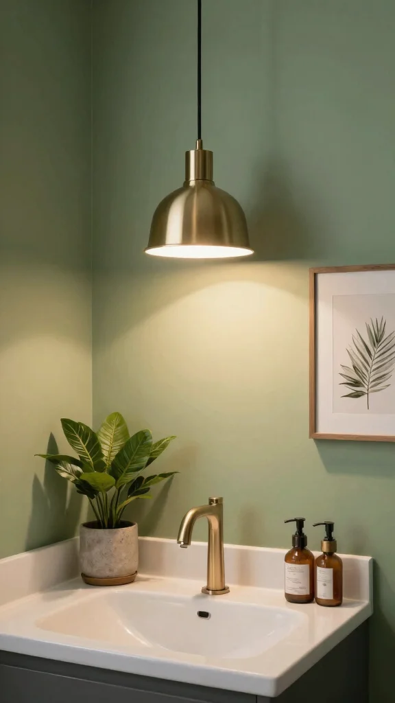 Great lighting is the unsung hero of sage green bathroom ideas. A pendant or wall sconce in a metallic finish adds personality and makes a small space feel brighter. Let the lighting be your focal point, while the green stays calm and cohesive.