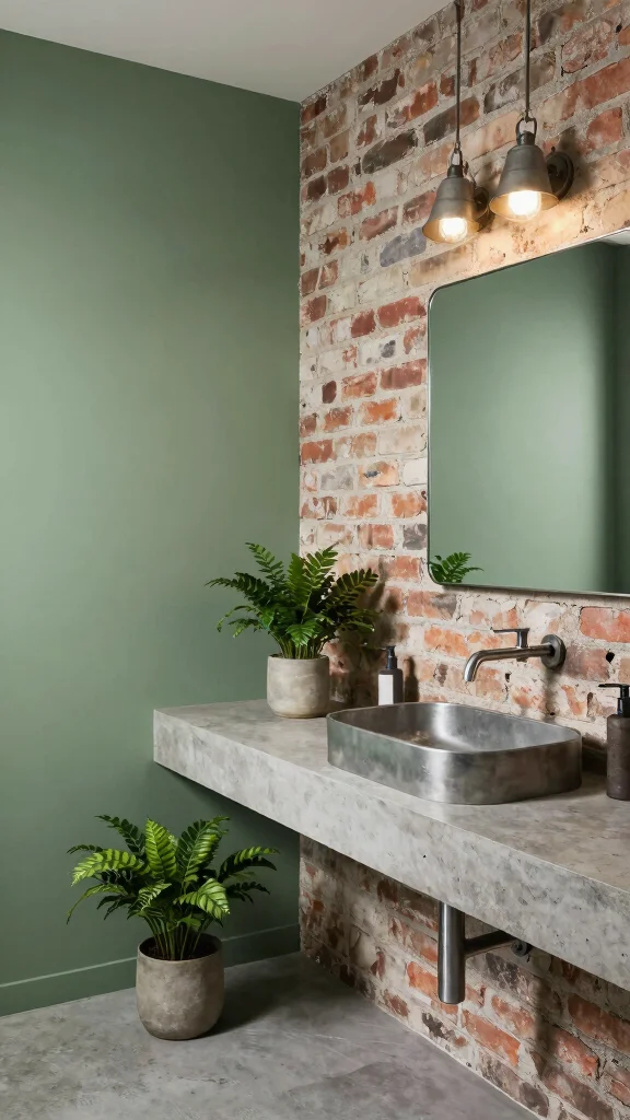 For a modern twist, consider blending sage green with industrial elements. The contrast of exposed brick, concrete fixtures, and metal accents against the softness of sage green creates a strikingly stylish bathroom atmosphere.