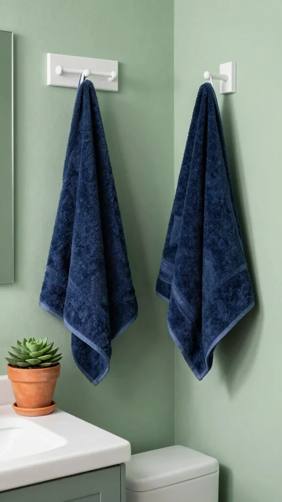 For a fresh look, consider deep navy blue towels against sage green walls. Terracotta planters or accessories can introduce warmth and depth, enhancing the overall aesthetic. This playful use of contrasting colors adds dimension and makes the sage green pop, creating an engaging space.