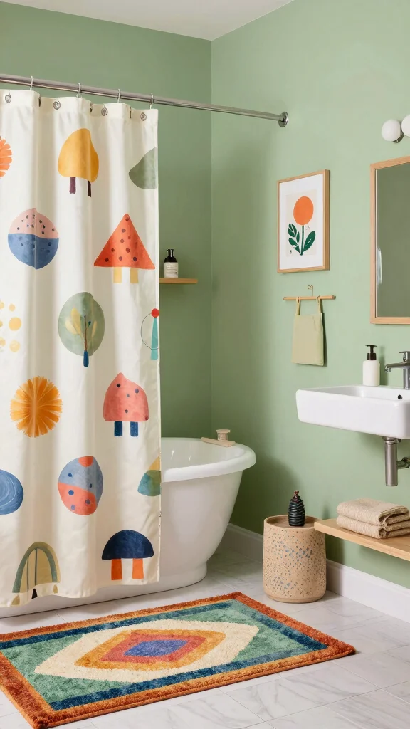 Introduce a whimsical touch to your sage green bathroom with playful decor items that create a lighthearted atmosphere. This can foster relaxation and happiness in your space. Consider funky shower curtains, quirky art pieces, or colorful rugs that contrast beautifully with the green.