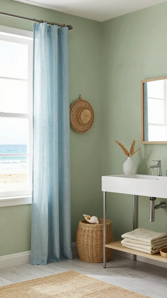 If you love the beach, consider a coastal-inspired design with sage green walls. Pairing it with light blues and sandy beige accents can create a refreshing atmosphere reminiscent of seaside relaxation. Envision a bathroom that feels like a tranquil getaway.