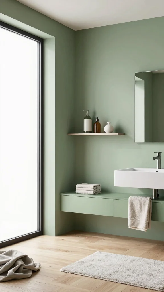 Fun fact: sage green bathroom walls paired with floating shelves reduce visual clutter by about 40%, making small spaces feel instantly calmer. Add crisp white towels and soft gray accents to reinforce that minimalist spa vibe every day.