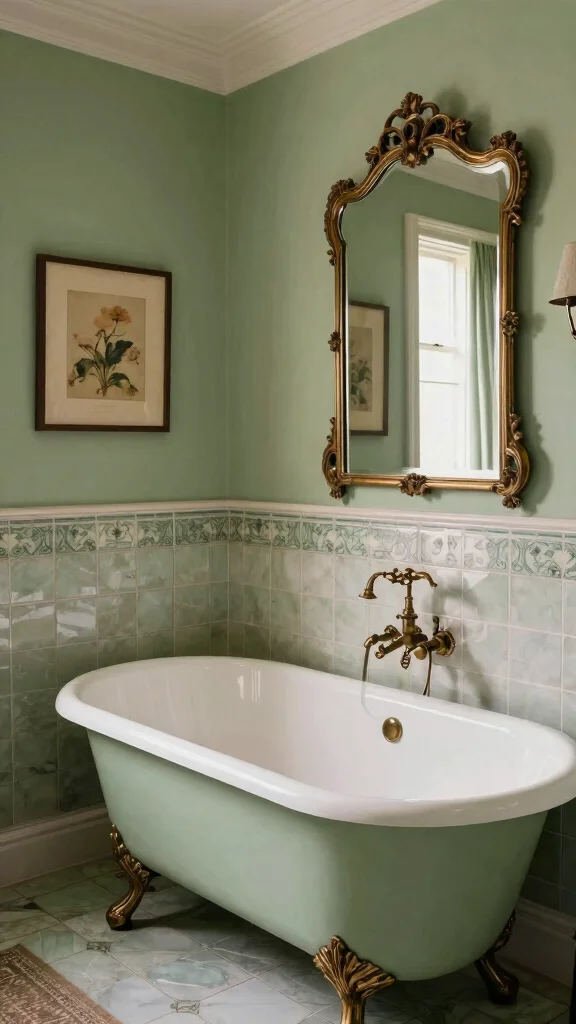 If you’re aiming for a timeless feel, consider blending vintage elements with your sage green walls. Incorporating vintage tiles, ornate mirrors, and clawfoot tubs introduces a classic charm that elevates the space. This sophisticated look can be achieved by choosing vintage lighting fixtures and accessories that contrast beautifully with the soft green.