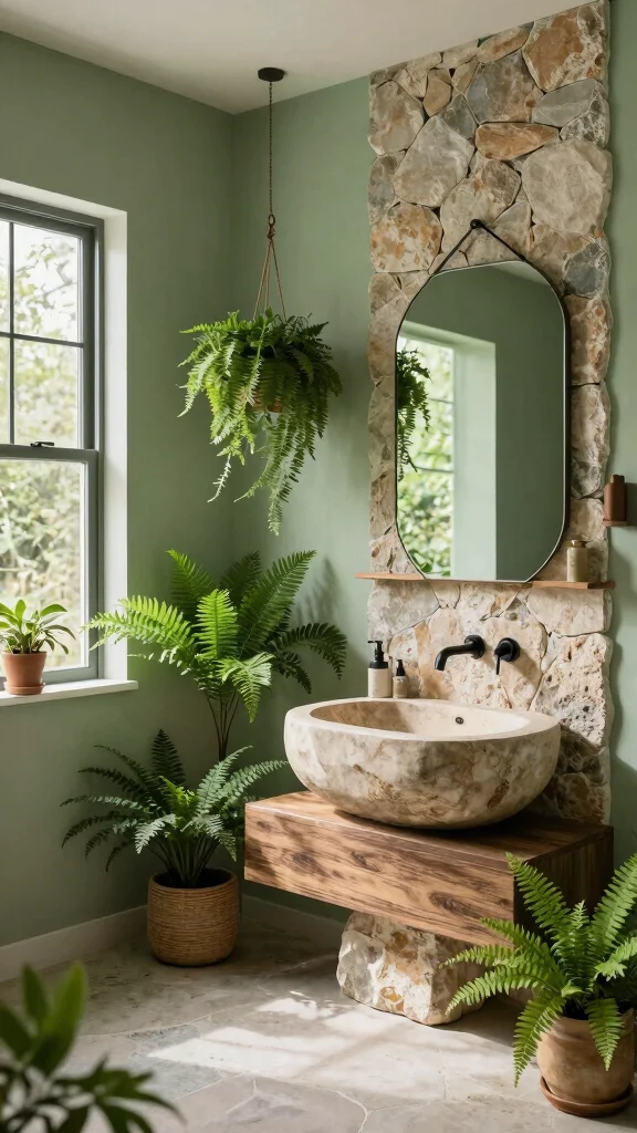 Bringing the outdoors inside can amplify the calming effects of sage green. By incorporating natural elements like stone, plants, and light woods, you can create a refreshing retreat in your bathroom. Imagine a stone accent wall or a natural stone basin that enhances this earthy feel.