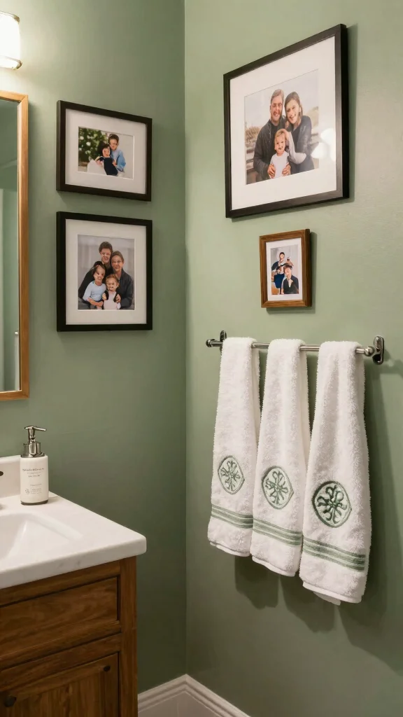 This approach adds character and creativity to your bathroom. The combination of art and sage green fosters a curated, inviting atmosphere.