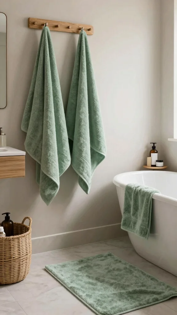 Choose sage green towels and bathrobes to maintain your color theme while ensuring comfort. Soft lighting and natural materials enhance the tranquil atmosphere, while relaxing music or scented candles create a multi-sensory experience.