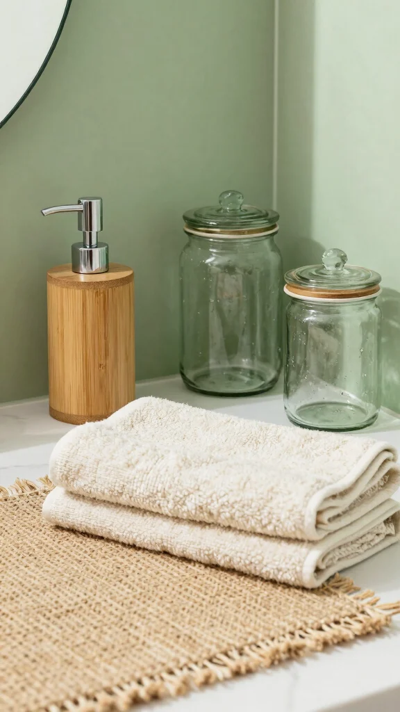 Textures help create visual interest and a cozy feel in your bathroom. Combine different fabrics and materials, like a plush sage green bath mat with sleek ceramic soap dispensers. Incorporate plants or woven baskets for a touch of nature. The contrast between soft and smooth textures can make your space feel inviting and relaxing.