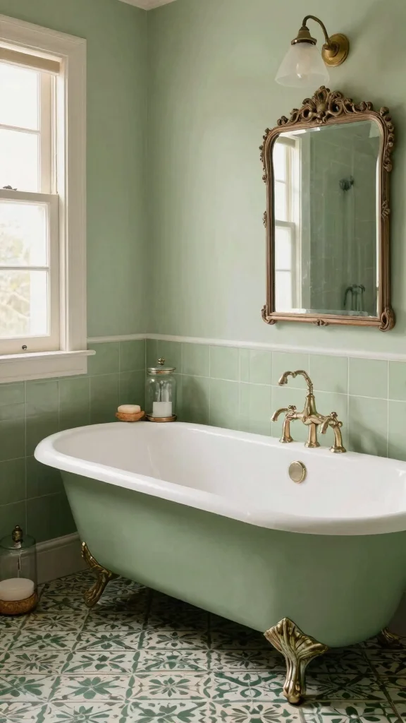 Sage green can introduce vintage charm into your bathroom design, creating an inviting atmosphere. Vintage-inspired fixtures and accessories offer a nostalgic touch that beautifully contrasts with the soothing color.