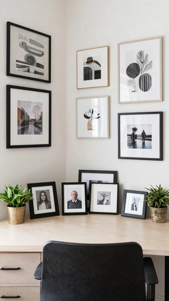To personalize your workspace, frame your favorite photos or artwork to create a gallery wall. Include plants that resonate with your personality and incorporate a decorative item that brings you joy or inspiration.