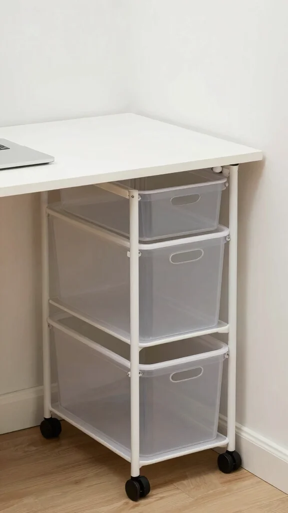 To maximize under-desk storage, consider using clear bins so you can easily see the contents. Rolling carts offer flexibility and easy access, while installing a small drawer unit under the desk can neatly store smaller items.