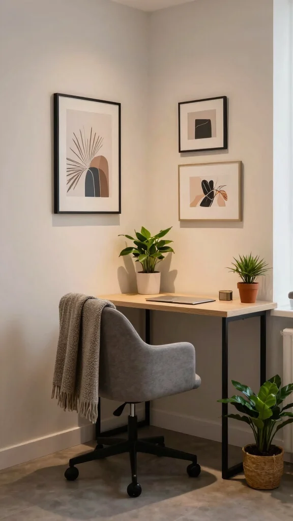 In a small space, less is often more. Stick to a minimalist decor style that promotes focus and productivity. Use a limited color palette and choose simple, clean lines for your furniture. Incorporate a few decorative elements that inspire you, like art or plants, but avoid clutter. This will help create a calming atmosphere that enhances your work efficiency.